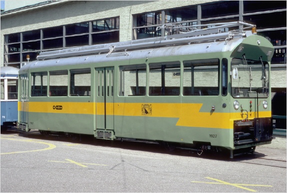 Der Xe 4/4 1927 der Verkehrsbetriebe Zürich behielt die vierflügligen Türen mit ungefassten Scheiben und den älteren Anstrich, bei welchem der gelbe Balken eine Fensterbreite weiter vorne den Knick macht.