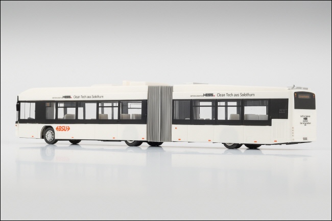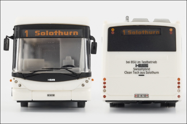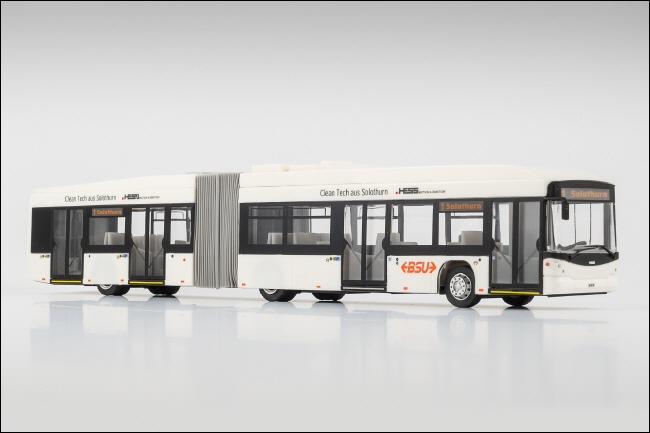 Im Jahr 2013 testete der Busbetrieb Solothurn und Umgebung (BSU) den Swisshybrid von HESS Bellach, ein ganz weiss lackierter Gelenkhybridbus mit markanter BSU-Aufschrift. Das Modell ist eine einmalige, limitierte Auflage. |