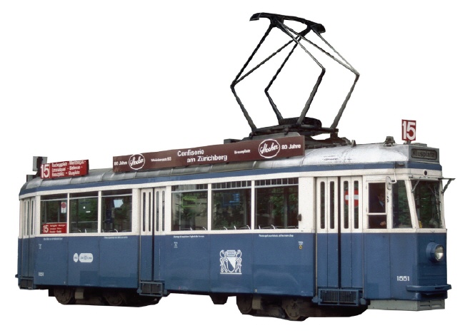 Modell des Be 4/4 1551 der Verkehrsbetriebe Zürich, wie er bis 1988 auf der Linie 15 als Solofahrzeug eingesetzt wurde.