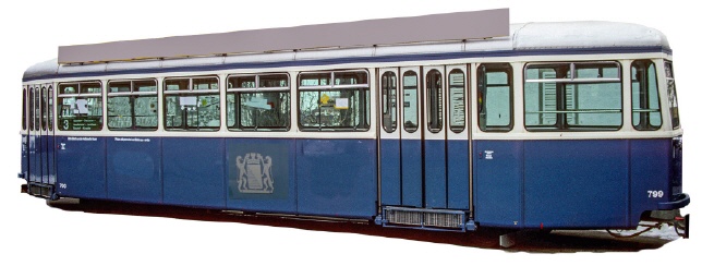 Modell des B 799, bekannt als "Basler" Anhänger, da er weitgehend den Anhängern B 1416-1510 der Basler Verkehrsbetriebe entspricht. In den Jahren 1973-1982 verkehrten die drei Basler Anhänger B 799-801 der VBZ hinter Be 4/4 und trugen das Silberlöwenlogo, bis sie als Anhängewagen zu den "Mirage"-Gelenktriebwagen umgebaut wurden. |