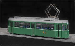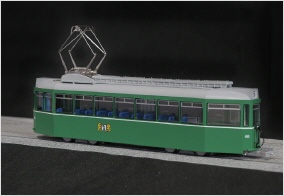 Modell des Be 4/4 453 in der letzten Ausführung mit Zierlinie und mit Basiliskenlogo. Das Vorbildfahrzeug wurde 1958 an die Basler Verkehrsbetrieb ausgeliefert, wo es bis Mqai 2001 wertvolle Dienste leistete. Dann wurde dieses Fahrzeug wie alle seine Geschwister überzählig und ausrangiert.