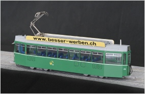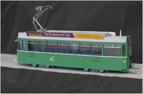 Modell des Be 4/4 472 und Be 4/4 473 aus der Bauserie 457-476 mit luftgefederten Drehgestellen, gummigefassten Fenstern und Einholmstromabnehmer in der letzten Ausführung mit eckigem Frontscheinwerfer und Vielfachsteuerleitung.