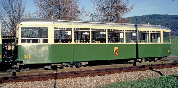 Modell des B 343 in der Ausführung der Einsatzjahre bei den Städtischen Verkehrsbetrieben Bern im olivgrün-beigen Anstrich. Das Vorbildfahrzeug wurde 1945 für die VBZ in Zürich gebaut (B 713) und wurde im November 1986 nach Bern verkauft. Bereits im April 1990 hatten die SVB keine Verwendung mehr für den mittlerweile 45jährigen Anhängewagen, daher erfolgte der Abbruch.