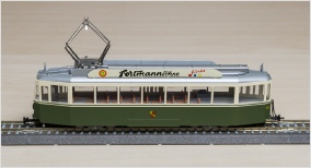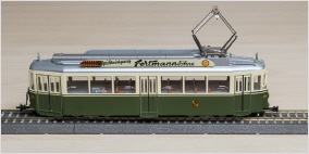 Modell des Be 4/4 105 der Städtischen Verkehrsbetriebe Bern im ursprünglichen Aussehen bei der Ablieferung, das heisst mit der noch nicht verbreiterten mittleren Türe, mit der zusätzlichen grünen Zierlinie sowie mit dem seinerzeit verwendeten Berner Wappen. Dem Original entsprechend schaut der Berner Bär auf der Türseite des Fahrzeugs nicht in Fahrtrichtung.