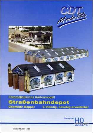 Kartonbausatz eines Strassenbahndepots im Fotodruck. Das Depot verfügt über zwei Einfahrten.