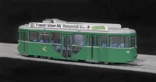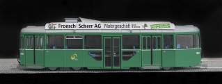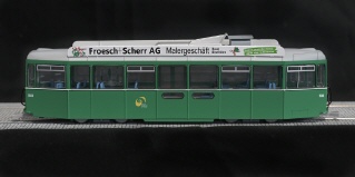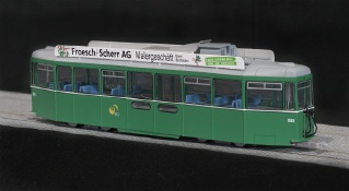 Die BVB haben eine Reihe Anhängewagen aus der Serie 1416-1506 zu Niederflurfahrzeugen umgebaut, indem in Wagenmitte ein Niederflurteil mit tief liegendem Einstieg eingebaut wurde. NAVEMO hat diese umfangreichen Änderungen beim Modell des Basler Anhängers auch nachgebildet und bietet das Modell des B 1503 mit Transparent-Anzeigen an. |