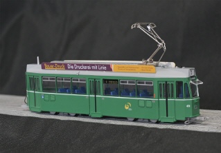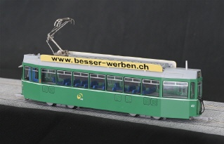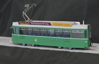 Modell des Be 4/4 472 und Be 4/4 473 aus der Bauserie 457-476 mit luftgefederten Drehgestellen, gummigefassten Fenstern und Einholmstromabnehmer in der letzten Ausführung mit eckigem Frontscheinwerfer und Vielfachsteuerleitung. |
