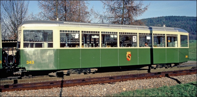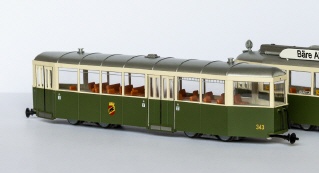 Modell des B 343 in der Ausführung der Einsatzjahre bei den Städtischen Verkehrsbetrieben Bern im olivgrün-beigen Anstrich. Das Vorbildfahrzeug wurde 1945 für die VBZ in Zürich gebaut (B 713) und wurde im November 1986 nach Bern verkauft. Bereits im April 1990 hatten die SVB keine Verwendung mehr für den mittlerweile 45jährigen Anhängewagen, daher erfolgte der Abbruch. |