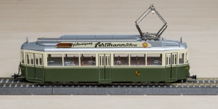 Modell des Be 4/4 105 der Städtischen Verkehrsbetriebe Bern im ursprünglichen Aussehen bei der Ablieferung, das heisst mit der noch nicht verbreiterten mittleren Türe, mit der zusätzlichen grünen Zierlinie sowie mit dem seinerzeit verwendeten Berner Wappen. Dem Original entsprechend schaut der Berner Bär auf der Türseite des Fahrzeugs nicht in Fahrtrichtung. |