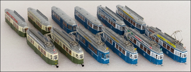 Die Lücke zwischen den zweiachsigen Oldtimern und den modernen Gelenkwagen wurde auch im Modell vor ein paar Jahren gefüllt. NAVEMO hat den schweizerischen Standardzug mit Motorwagen Be 4/4 und Anhängewagen B4 in den Städtevarianten Zürich, Bern und Basel ins Sortiment aufgenommen. Die Modelle lassen keine Wünsche offen, und es werden alle städtespezifischen Details berücksichtigt. |