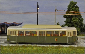 Modell des B 329 in der Ausführung der letzten Einsatzjahre. Das Fahrzeug wird mit aufsteckbaren Werbetafeln gefertigt. Die Kleinteile werden werkseitig alle montiert. Die Stromabnahme erfolgt ab allen vier Achsen. Unter dem Wagendach, das ohne Werkzeuge einfach abgenommen werden kann, befindet sich die sechspolige Digitalschnittstelle (NEM 651). Das Modell ist werkseitig für Analogbetrieb ausgerüstet. Der Fahrgastraum ist beleuchtet.